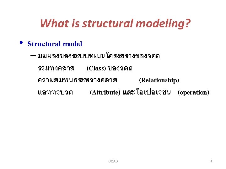Structural Diagrams • ประเภทของ Structural Diagrams – static structural diagrams • class diagram • object diagram – implementation diagrams • component diagram • deployment diagram OOAD 9