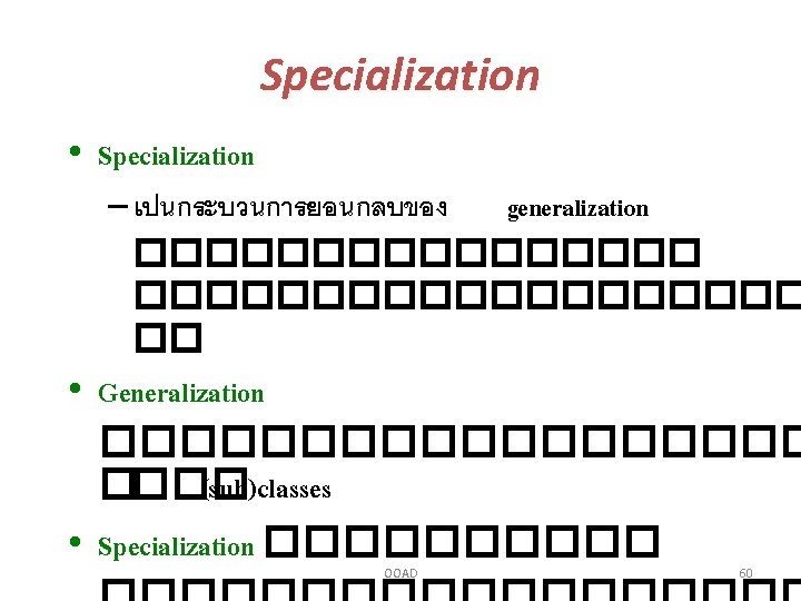 Single & Multiple Inheritance • generalizations ����� class hierarchies ���� “subclass” ������� 1 “superclass” ���� “single inheritance” • แตมบางสถานการณท “subclass” �������� 1 “superclass” ���� “multiple inheritance” OOAD 57