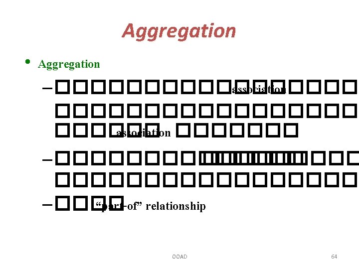 Class diagrams (cont. ) • • Associations Generalization ��� Classification Aggregation OOAD 63
