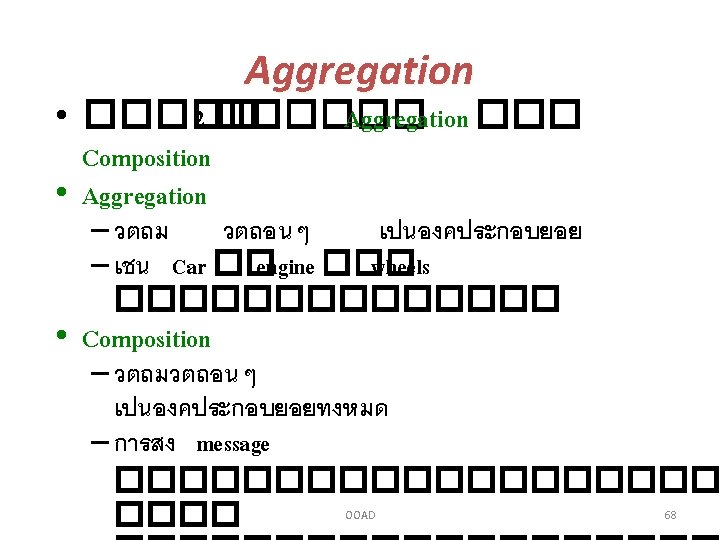 Association and Aggregation • Question : Association ���� Aggregation? • Answer : ���� Aggregation – ถาความสมพนธเปน “part of” – Operation ����������������� OOAD 71