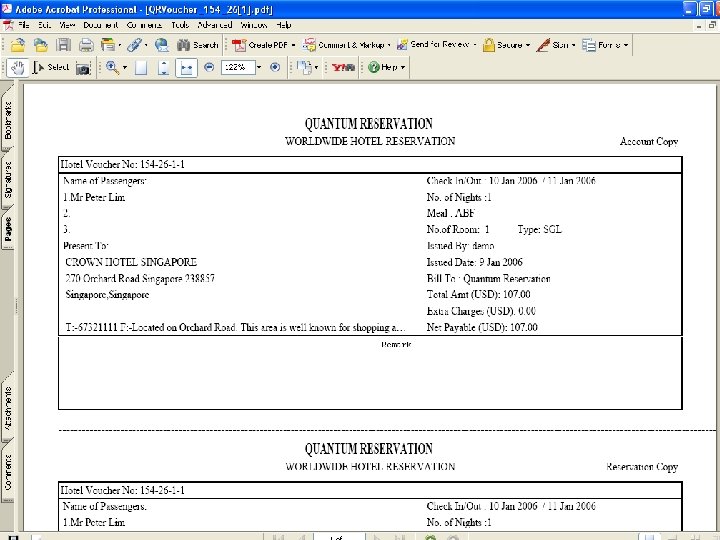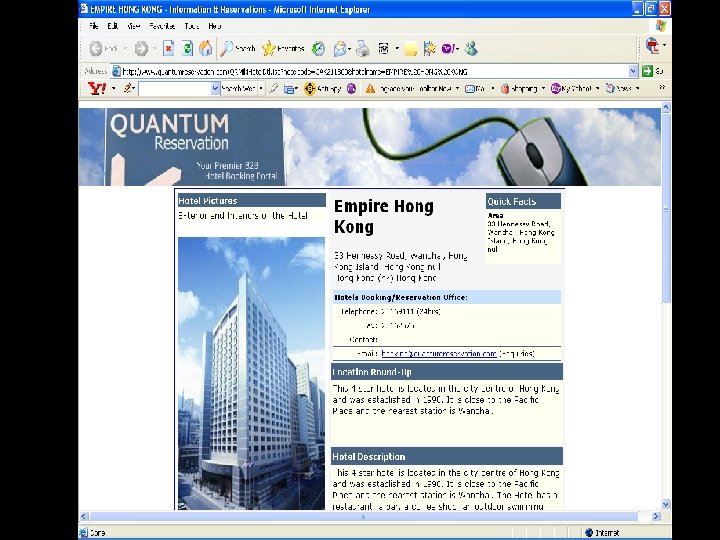 89 Club Street #01 -01, Singapore 069457 Tel: (65) 6220 -5005 / Fax: (65) 6221 -5115 Email: quanres@singnet. com. sg / Web Site: www. quantumreservation. com COMPANY PROFILE Mission To provide worldwide hotel reservation service and all corresponding land arrangements exclusively to travel agents globally. Background Quantum Reservation does not deal with passengers or corporations directly. Our company is a pure wholesaler that is committed to provide all land service only to travel agents. We therefore will not compete with our clients, the travel agents for their retail and corporate customers. We have been established since 1993. Whilst we are based in Singapore, our clients (travel agents) that use our services are global. In fact, because of our regional expansion, we are proud to announce that we are the largest center for worldwide hotel reservation service in Southeast Asia. We have offices in Singapore (HQ), Kuala Lumpur, Bangkok, Jakarta and Bali. We intend to open offices in Manila, Hong Kong and Shanghai this year. Operations As a global provider of hotel reservation service, we have over 8000 hotels worldwide in over 400 cities. For example, in USA, we have hotels in more than 150 cities. In Asia, we deal with most hotel chains directly. Hence, we have the ability and capability to confirm bookings for you within hours, if not, within minutes if your bookings are urgent. In addition, we have allotments and confirmation can be almost instantaneous. Products & Services Our competitive advantage is global FIT hotel reservation service. However, we have also leveraged on our strength of our Regional Offices to provide the following land services: Airport hotel transfers FIT tour packages Group tour packages Incentive groups Organizational Structure & Information Our operations and sales teams are divided by geographical boundaries and our network of offices in ASEAN includes: Singapore (HQ) – 89 Club Street, Singapore 069457 Kuala Lumpur – 67 Jalan Raja Chulan, Wisma Goldhill, Level 5, Unit No 510, Kuala Lumpur 50200 Bangkok – 92/52 Sathorn Thani Tower 2, 18 th Floor, North Sathron Road, Bangkok 10500 Jakarta – Ruko Apt Graha Cempaka Mas, Blok D No 28 4 th Floor, Jalan Letjen Suprapto, Jakarta 10640