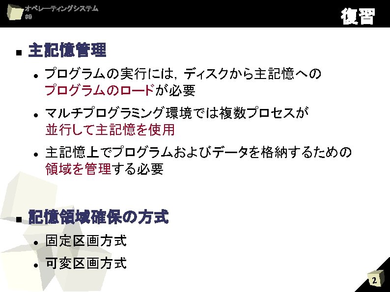 オペレーティングシステム #9 物理空間 仮想アドレス 07 456 0 x 0000 = 0 x 0 FFF 0 x 1000 0 x 1 FFF 0 x 2000 物理アドレス 1 ページングの動作 0 x 2 FFF 0 x 3000 456 0 x 3 FFF 00 01 02 03 04 05 06 07 08 02 0 1 2 3 V P C ページフレーム 1 1 0 011 0 0 1 1 主記憶上に 1 ない 1 01 011 0 1 1 0 x 00000 0 x 00 FFF 0 x 01000 0 x 01 FFF 0 x 02000 0 x 02 FFF 0 x 03000 0 x 03 FFF 0 x 04000 0 x 04 FFF 0 x 05000 0 x 05 FFF 0 x 06000 0 x 06 FFF 0 x 07000 0 x 07 FFF 0 x 08000 0 x 08 FFF 0 x 09000 0 x 09 FFF 00 01 02 03 04 05 06 07 08 09 18