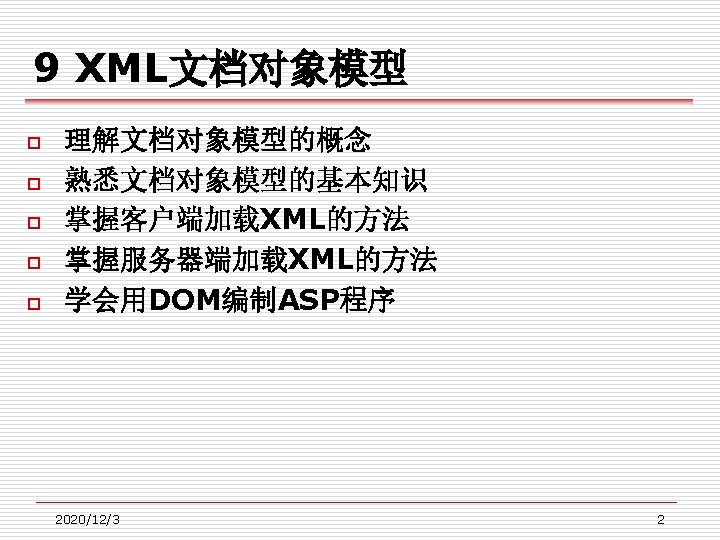 9. 2 客户端加载XML o 9. 2. 1加载外部XML文件 n VBScript可通过下述方式来加载文档 n Dim xml. Dom n ' 建立XML DOM对象 n Set xml. Dom = Create. Object("MSXML 2. DOMDocument. 4. 0 ") n ' 设置xml. Dom的async为false, 即异步为假,保证 XML解析器暂停执行,直到XML文件加载完成 n xml. Dom. async = False n ' 加载XML文件 n xml. Dom. load("code 9_1. xml") 2020/12/3 7