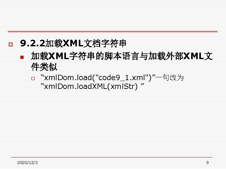 o 与之对应的Java. Script加载外部XML文件的代码 如下: n // 建立XML DOM对象 n var xml. Dom = new Active. XObject("MSXML 2. DOMDocum ent. 4. 0") n xml. Dom. async = "false" n // 加载XML文件的字符串 n xml. Dom. load("code 9_1. xml") 2020/12/3 8