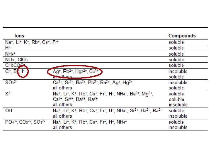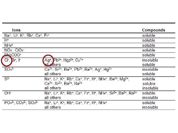 3. Precipitate Formation • • uses the solubility properties of ions to identify the presence of an unknown ion we can add a known reactant to a solution and observe whether a precipitate forms e. g. , How can you test for the presence of chloride ions in a sample of sea water? Let’s look at our Solubility Table …