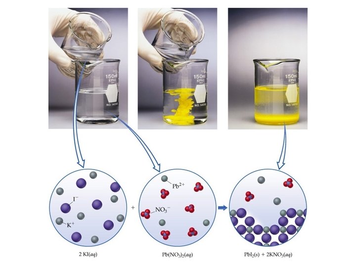 2 KI (aq) + Pb(NO 3)2 (aq) 2 KNO 3 (aq) + Pb. I 2 (s) We can rewrite the equation to show that all soluble ionic compounds are dissociated into their ions in the solution. 2 K+(aq) + 2 I-(aq) + Pb 2+(aq) + 2 NO 3 -(aq) 2 K+(aq) + 2 NO 3 -(aq) + Pb. I 2 (s) this is a total ionic equation
