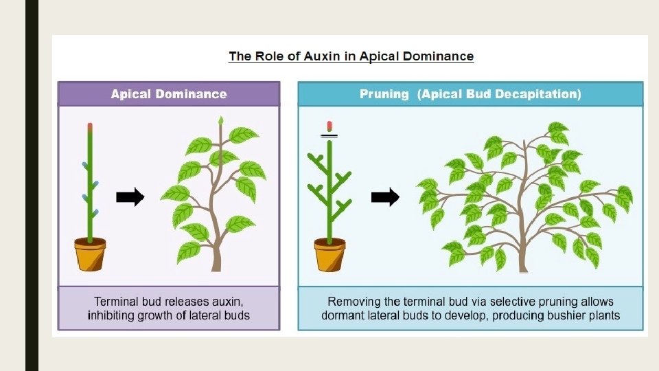 Auxin ■ When auxins are produced by the shoot apical meristem, it promotes growth in the shoot apex via cell elongation and division. – The production of auxins additionally prevents growth in lateral buds, a condition known as apical dominance. – Apical dominance ensures that a plant will use it energy to grow up towards the light in order to outcompete other plants. – As the distance between the terminal bud and axillary bud increases, the inhibition of the auxiliary bud by auxin diminishes. – Different species of plants will show different levels of apical dominance.