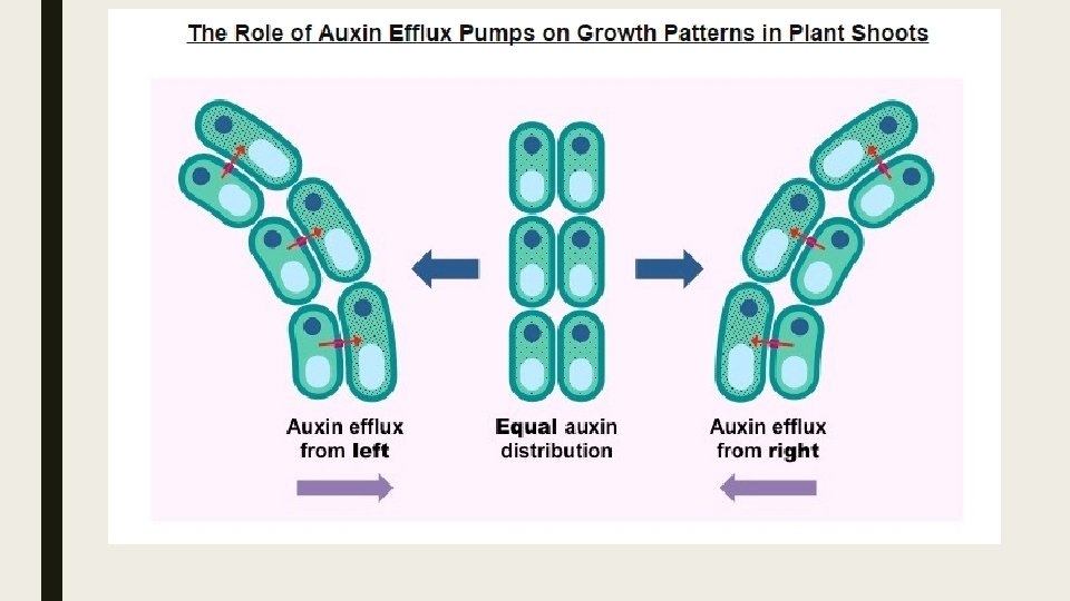 ■ Auxins are a group of hormones produced by the tip of a shoot or root (apical meristem) that regulate plant growth. – Auxin efflux pumps can set up concentration gradients within tissues – changing the distribution of auxin within the plant. – These pumps can control the direction of plant growth by determining which regions of plant tissue have high auxin levels. – Auxin efflux pumps can change position within the membrane (due to fluidity) and be activated by various factors.