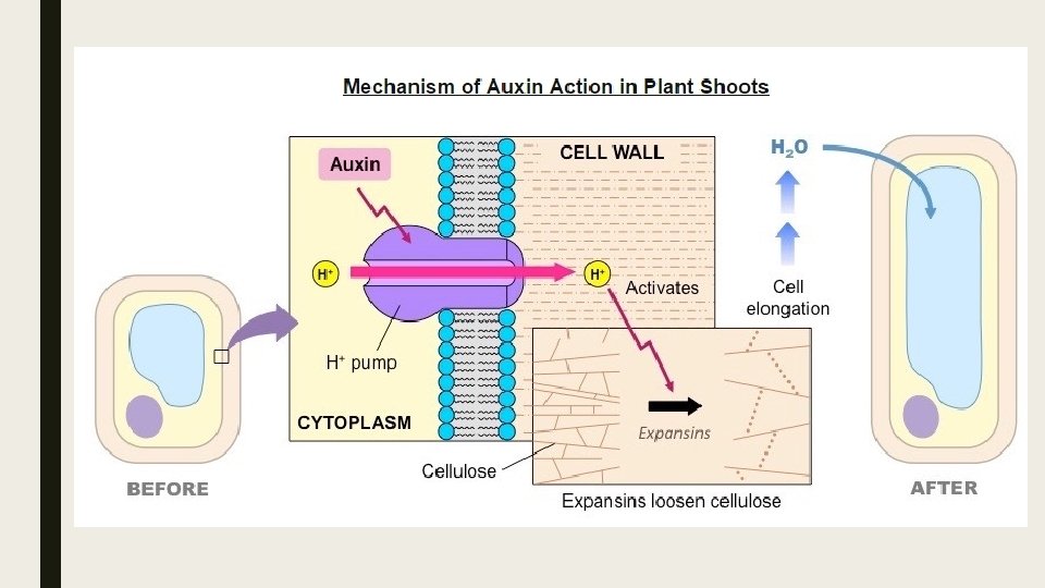 ■ Auxin efflux pumps can set up concentration gradients of auxin in plant tissue. (U. 5) ■ Auxin is a plant hormone and influences cell growth rates by changing the pattern of gene expression with a plant’s cells. (U. 6) ■ Auxin’s mechanism of action is different in shoots and roots as different gene pathways are activated in each tissue. ■ In shoots, auxin increases the flexibility of the cell wall to promote plant growth via cell elongation. ■ Auxin activates a proton pump in the plasma membrane which causes the secretion of H+ ions into the cell wall. ■ The result is a decrease in p. H which causes cellulose fibers within the cell wall to loosen (by breaking the bonds between them). ■ Additionally, auxin upregulates expression of expansions, which similarly increases the elasticity of the cell wall. ■ With the cell wall now more flexible, an influx of water (to be stored in the vacuole) causes the cell to increase in size.