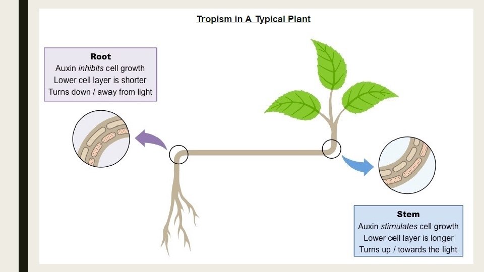 ■ In shoots, high auxin concentrations promote cell elongation, meaning that: – The dark side of the shoot elongates and shoots grow towards the light (positive phototropism) – The lower side of the shoot elongates and roots grow away from the ground.