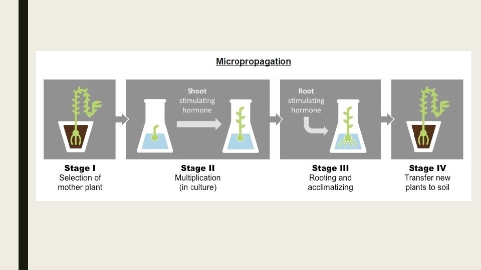 ■ This process of micropropagation involves a number if key steps: – Specific plant tissue (typically from the undifferentiated shoot apex) is selected from a stock plant and sterilized. – The tissue sample (explant) is grown on a sterile nutrient agar gel – The explant is treated with growth hormones (auxins) to stimulate shoot and root development. – The growing shoots can be continuously divided and separated to form new samples (multiplication phase) – Once the root and shoot are developed, the cloned plant can be transferred to soil.
