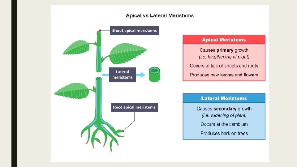 Meristem ■ Mitosis and cell division in the shoot apex provide cells needed for extension of the stem and development of leaves. (U. 2) ■ Meristematic tissue can be divided into apical meristems and lateral meristems. ■ Apical meristems occur at shoot and root tips and are responsible for primary growth (plant lengthening) ■ Lateral meristems occur at the cambium and are responsible for secondary growth (plant widening/thickening). ■ Apical meristems give rise to new leaves and flowers, while
