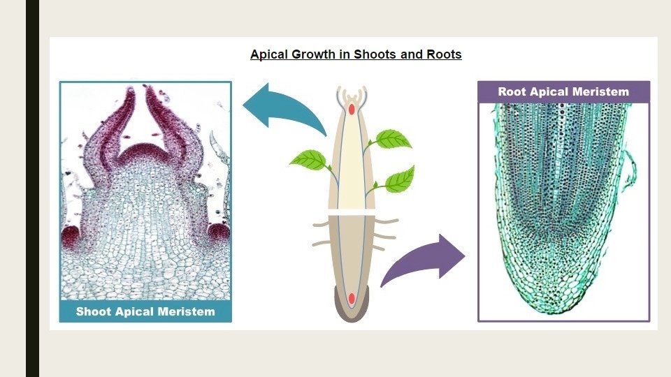 ■ The apical meristems give rise to primary growth (lengthening) and occurs at the tips of the roots and shoots. ■ Growth at these regions is due to a combination of cell enlargement and repeated cell division (mitosis and cytokinesis) ■ Differentiation of the dividing meristem gives rise to a variety of stem tissues and structures – including leaves and flowers.