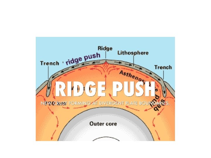 • -Ridge-Push : causes the stiff oceanic lithosphere to slide down the sides of the oceanic ridge as a result of gravity. • Ridge-push an slab-pull are acting together moving ocean lithosphere from mid-ocean ridges toward subduction zones and then down into the mantle. • Downward flow of subducted ocean lithosphere must be equal to upward flow of rock back toward the surface.