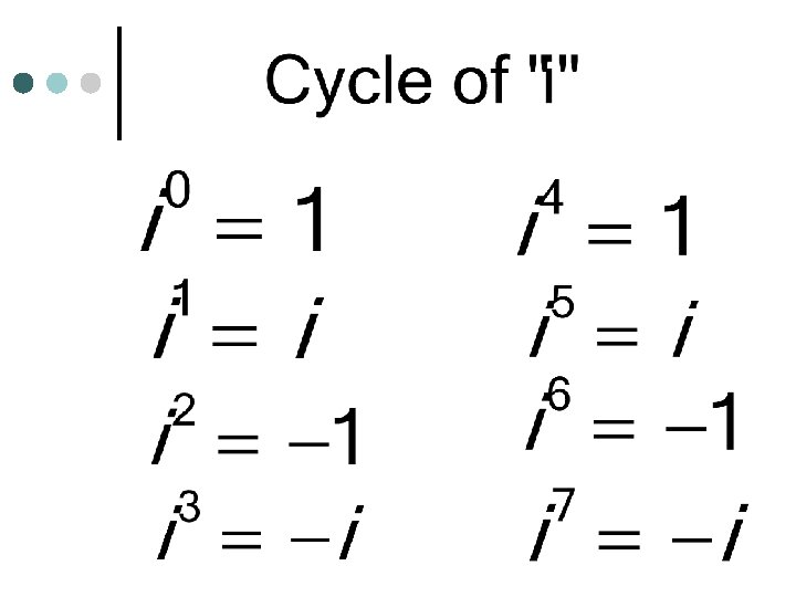 Simplify. To figure out where we are in the cycle divide the exponent by 4 and look at the remainder.