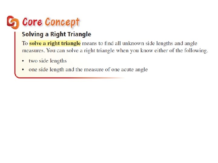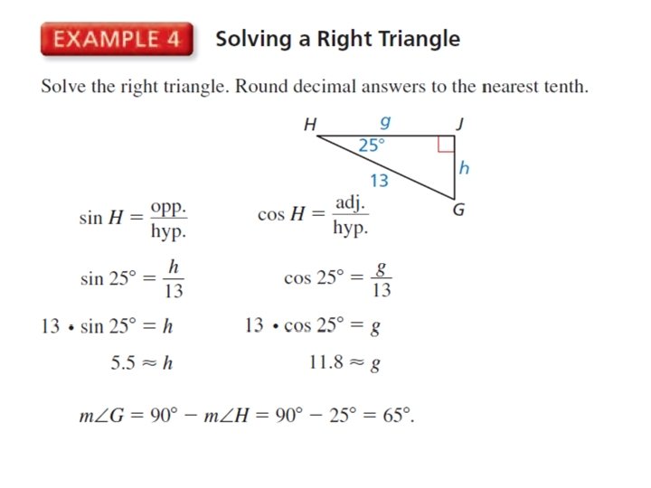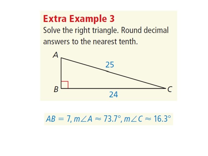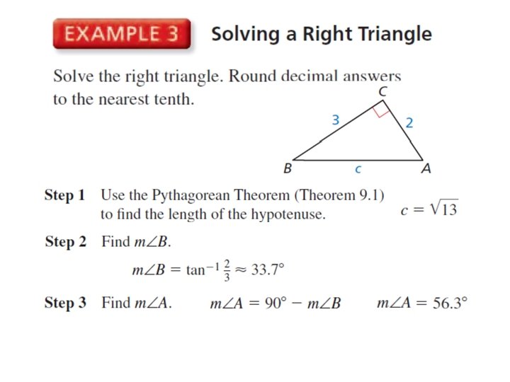 Lesson Quiz: Use your calculator to find each angle measure to the nearest degree. 1. cos-1 (0. 97) 2. tan-1 (2) 3. sin-1 (0. 59) Find the unknown measures. Round lengths to the nearest hundredth and angle measures to the nearest degree. 4. 5.