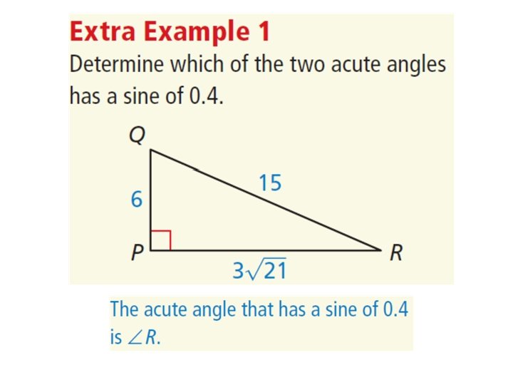 In Lesson 9 -5, you learned that sin 30° = 0. 5. Conversely, if you know that the sine of an acute angle is 0. 5, you can conclude that the angle measures 30°. This is written as sin-1(0. 5) = 30°.