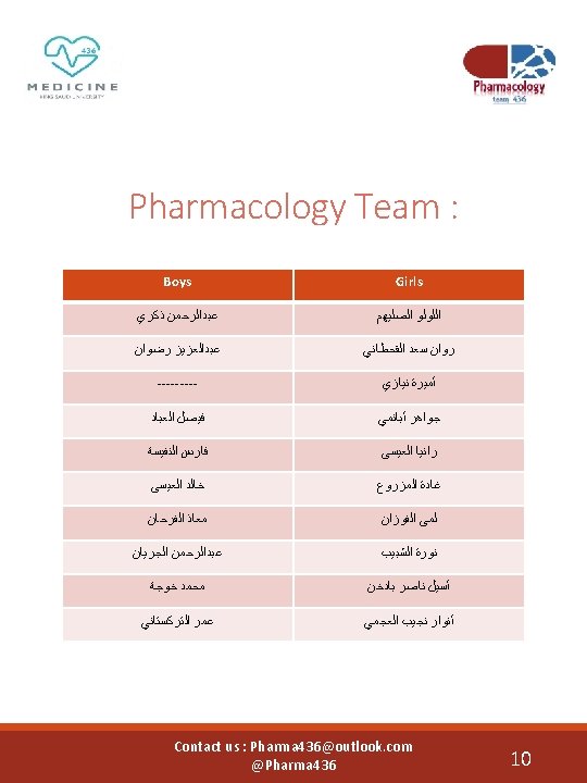 Qick Quiz https: //www. onlineexambuilder. com /pharmacology-l 9/exam-110846 Helpful video https: //www. youtube. com/watch? v=f j. Dg. KSVspo. U&t=8 s Contact us : Pharma 436@outlook. com @Pharma 436 9