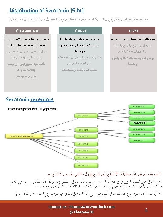 Therapeutic uses: • No current therapeutic use of bradykinin • Increased bradykinin is implicated in therapeutic efficacy and cough produced by ACEIs Serotonin [5 ht] Serotonin is synthesized from the amino acid L-tryptophan Contact us : Pharma 436@outlook. com @Pharma 436 5