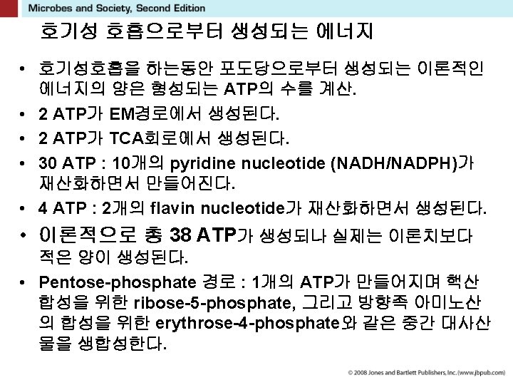 Microbial Metabolism • Respiration and glycolysis(호흡과 해당과정) – Glycolysis(해당과정) • • Breakdown of glucose into 2 pyruvic acids Requires investment of 2 ATPs Generates 2 net ATPs Requires investment of 2 NAD+s Generates 2 net NADHs Occurs in cytoplasm Does not require O 2 First process in both aerobic and anaerobic breakdown of glucose