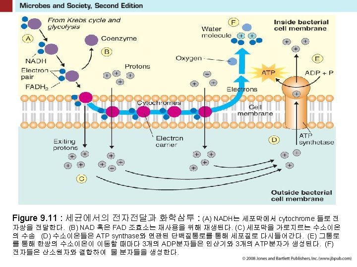 Microbial Metabolism • The electron transport system and chemiosmosis(화학삼투) – Occurs at plasma membrane in prokaryotes – Occurs in mitochondria in eukaryotes – Electron transport chain • Cytochromes(철을 함유한 세포단백질로서 전자쌍을 전달하는 역할. ) • NADH relays its energy to cytochromes – NADH gets oxidized to NAD+ – High energy electrons from NADH enter electron transport chain – As electrons get passed to each member in the chain, they lose a little bit of energy, until they reach ground state – The energy provided by 1 NADH is used to pump 6 H+ ions across the membrane – Oxygen combines with the ground state electrons and H 2 to create water – This H+ pumping process is repeated 9 more times, once for each NADH from glycolysis, conversion of pyruvic acid to acetyl Co. A, and the Krebs cycle – Total of 60 H+ moved across membrane for all NADHs