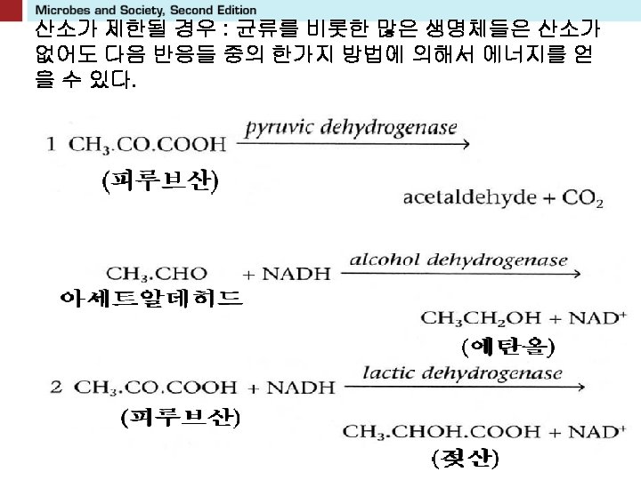 Microbial Metabolism • Fermentation(발효) – Anaerobic process (no oxygen required) – Input is pyruvic acid – End products • Acid • Alcohol • Gas (e. g. , CO 2) – Means to recycle NADH to NAD+, to return to glycolysis – Saccharomyces uses fermentation to produce ethyl alcohol • All alcoholic beverages – Streptococcus and Lactococcus produce lactic acid • Converts condensed milk into yogurt – Other species use fermentation to age cheese
