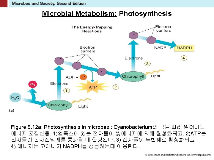 Microbial Metabolism: Photosynthesis Figure 9. 12 b: Photosynthesis in microbes : 탄소포집반응 : 1) 이산화탄소는 ribulose bisphosphate(Ru. BP)와 결합되어 불안정한 6 -탄소 분자가 된다. 2) 2분자의 phospho glyceraldehyde(PGAL)가 된다. 3) 2개의 3 -탄소 PGAL분자들은 결국 포도당을 만들고 4) 나머지는 ATP와 함께 ribulose bisphosphate를 형성하기 위해 이용되고 반응은 계 속된다.