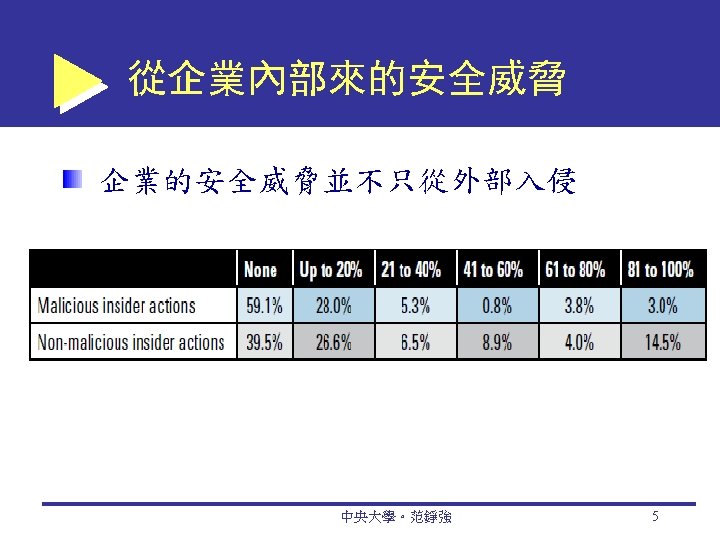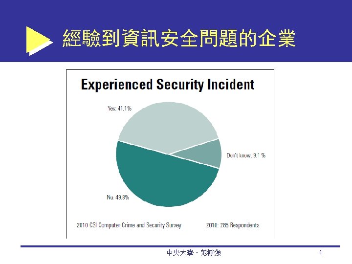 安全威脅有多大? 2010年電腦犯罪及安全調查 來源:Computer Security Institute (CSI), CSI Survey 2010/11 2007年美國企業因資訊安全問題而衍生的 損失,平均高達 35萬 (2006: 17萬) 41. 1%企業遭受到某種資訊安全破壞 (2007: 46%; 2006: 53%; 2005: 56%) https: //cours. etsmtl. ca/log 619/documents/divers/CSIsurvey 2010. pdf 中央大學。范錚強 3