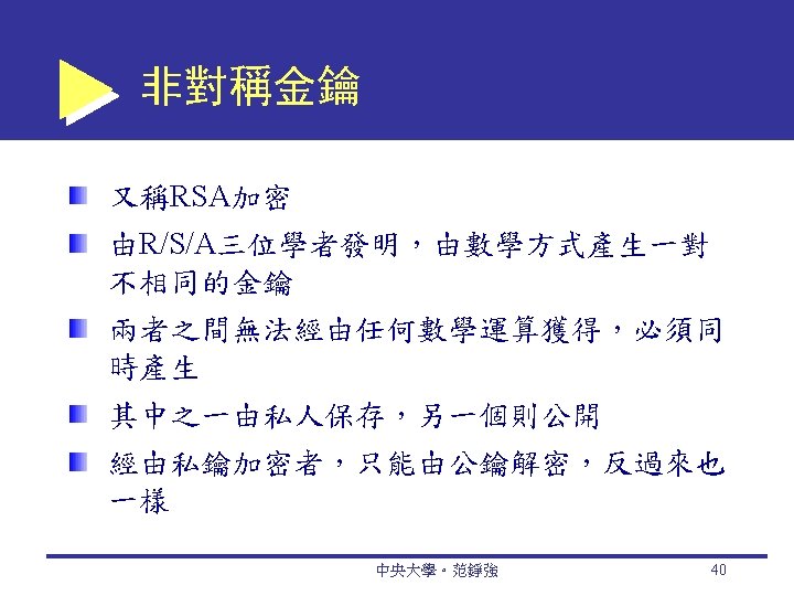 Public (Asymmetric) Key Encryption public key encryption Method of encryption that uses a pair of matched keys—a public key to encrypt a message and a private key to decrypt it, or vice versa public key Encryption code that is publicly available to anyone 中央大學。范錚強 39