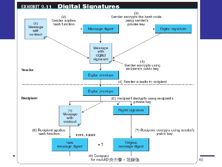 Digital Signatures digital signature An identifying code that can be used to authenticate the identity of the sender of a document hash A mathematical computation that is applied to a message, using a private key, to encrypt the message digest A summary of a message, converted into a string of digits, after the hash has been applied digital envelope The combination of the encrypted original message and the digital signature, using the recipient’s public key 中央大學。范錚強 45