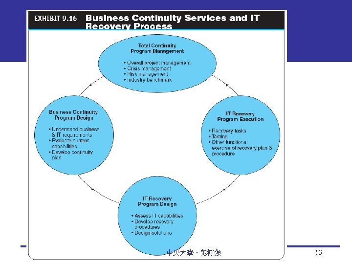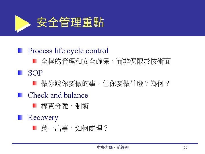 Business Continuity and Disaster Recovery Planning Disaster avoidance An approach oriented toward prevention. The idea is to minimize the chance of avoidable disasters (such as fire or other human-caused threats). Risk-management and cost-benefit analysis Risk-Management Analysis Ethical Issues 中央大學。范錚強 66