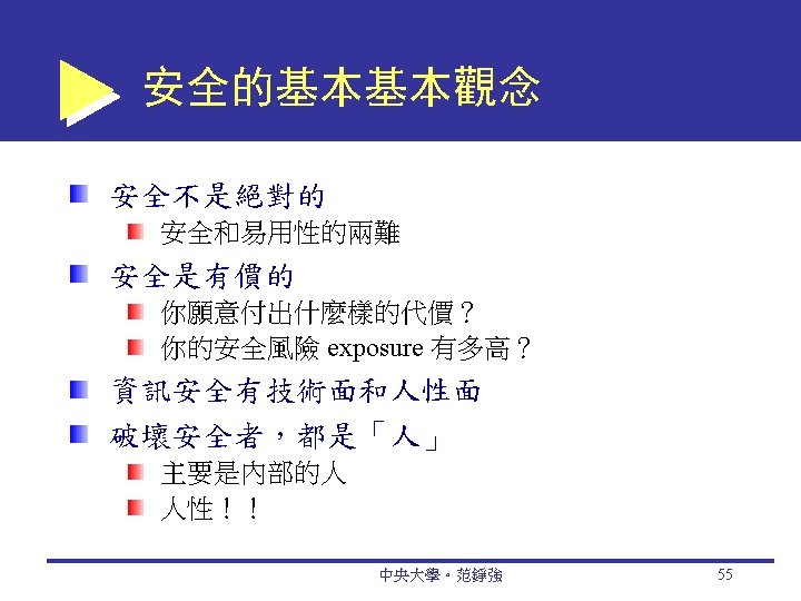 Basic Security Terminology Business continuity plan 商業存續計畫 A plan that keeps the business running after a disaster occurs; each function in the business should have a valid recovery capability plan Cybercrime 網路犯罪 Intentional crimes carried out on the Internet Cybercriminal 網路罪犯 A person who intentionally carries out crimes over the Internet Exposure 風險暴露 The estimated cost, loss, or damage that can result if a threat exploits a vulnerability 中央大學。范錚強 11 9 -11