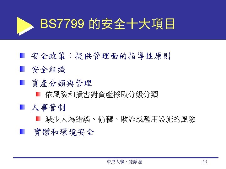 EC Security Policies and Training Acceptable use policy (AUP) Policy that informs users of their responsibilities when using company networks, wireless devices, customer data, and so forth. 中央大學。范錚強 67
