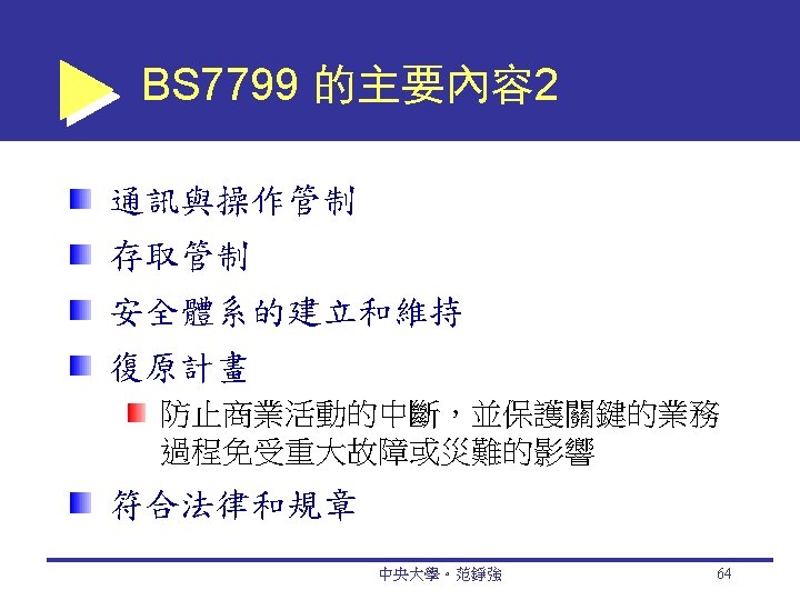 CIA Triad Confidentiality Assurance of data privacy and accuracy. Keeping private or sensitive information from being disclosed to unauthorized individuals, entities, or processes Integrity Assurance that stored data has not been modified without authorization; a message that was sent is the same message that was received Availability Assurance that access to data, the Web site, or other EC data service is timely, available, reliable, and restricted to unauthorized users 中央大學。范錚強 30