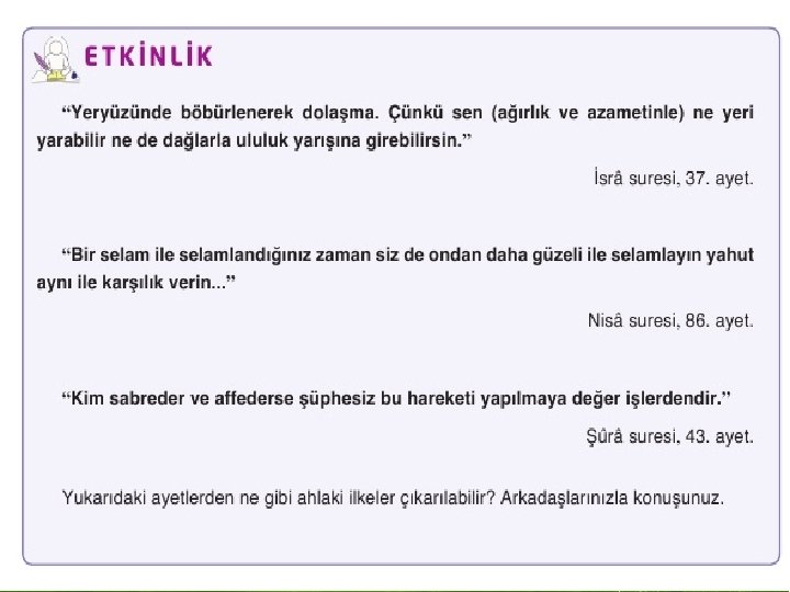 “Allah’a ibadet edin ve ona hiçbir şeyi ortak koşmayın, Ana-babaya, akrabaya, yetimlere, yoksullara, yakın komşuya, uzak komşuya, yakın arkadaşa, yolcuya , ellerinizin altında bulunanlara (. . . Hizmetçi ve benzerlerine) iyi davranın; Allah kendini beğenen ve daima böbürlenip duran kimseyi sevmez. ” ( Nisa – 36 ) “Ölçtüğünüz zaman tastamam ölçün ve doğru terazi ile tartın. Bu hem daha iyidir hem de neticesi bakımından daha güzeldir. ” ( İsra – 35 ) “Rahman’ın (has) kulları, yeryüzünde tevazu ile yürürler ve kendini bilmez kimseler onlara laf attığında (incitmeksizin) ‘Selam!’ derler (geçerler). ” ( Furkan – 63 )