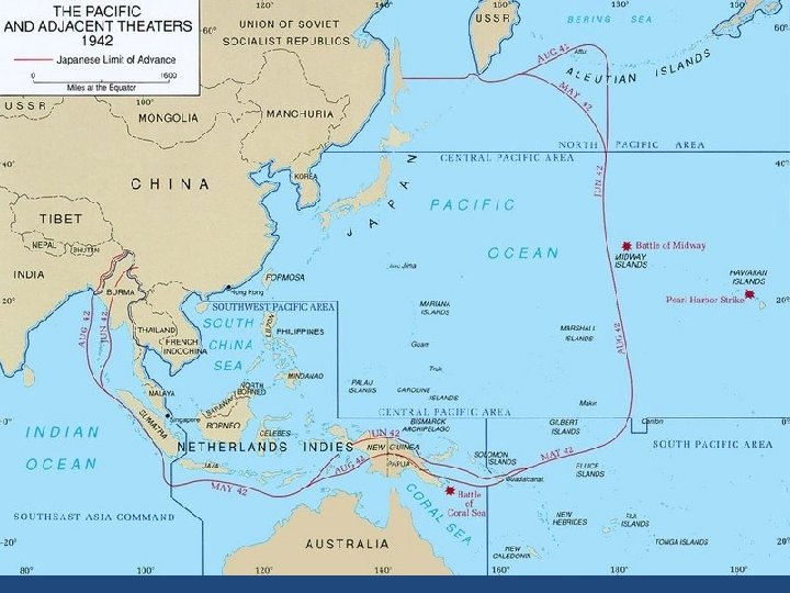 Pacific Theater • • Battle of Coral Sea (May 1942) Battle of Midway (June 1942) Island-hopping Not without a fight… – Guadalcanal (Aug 1942 -Feb 1943) – Leyte Gulf (Oct 1944) • kamikazes – Iwo Jima (Feb-Mar 1945) – Okinawa (Apr-June 1945)