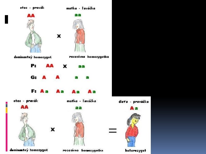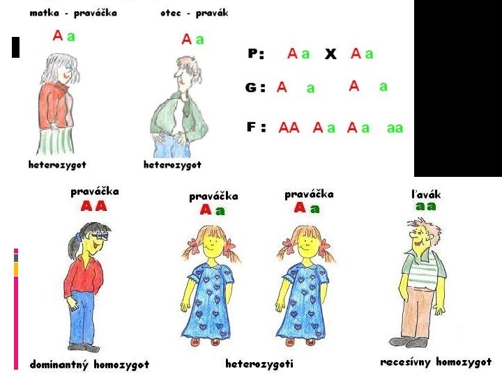 v jadre je vždy určitý počet chromozómov - človek 46 = 23 párov chromozómy sú vždy v páre – 1. od otca, 2. od matky (čiže aj gény) Medzi týmito génmi existuje vzťah dominancie a recesivity – dominantný gén je prevládajúci – prejaví sa a recesívny gén je potlačený => vzhľad jedinca závisí od toho aké gény má vo svojich bunkách