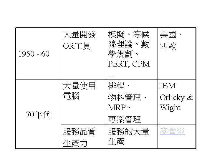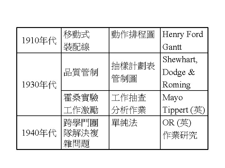 全面品質管理及品質認證 • Total Quality Management, TQM –戴明(Edward Deming) –朱蘭(Joseph M. Juran) –寇斯比(Philips Crosby) • 1987年美國成立美國國家品質獎(Baldrige National Quality Award) • 國際標準組織(International Organization for Standardization)推動設立的ISO 9000認證