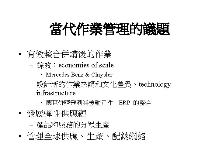 • 加強供應的期貨化 – Internet-based B 2 B commerce • Switching cost is low • Long-term agreement is obsoleting • EMS (electronic manufacture service): 98/2 • 成為「服務廠商」 – Personalized service