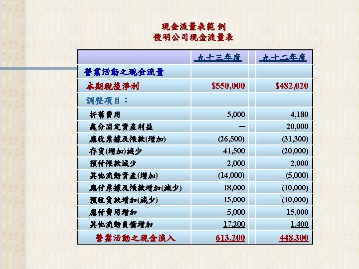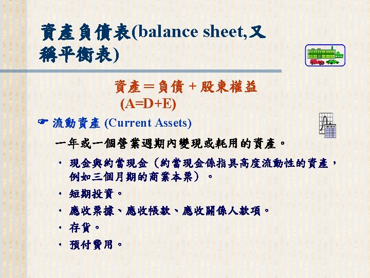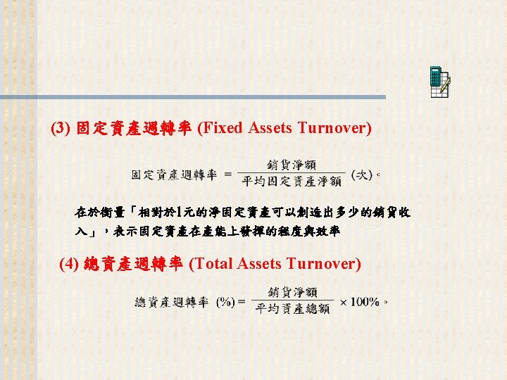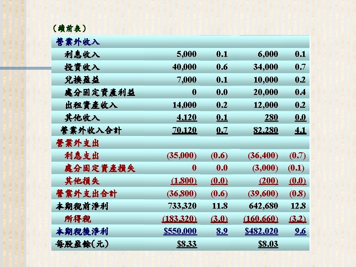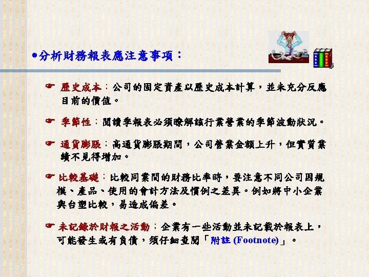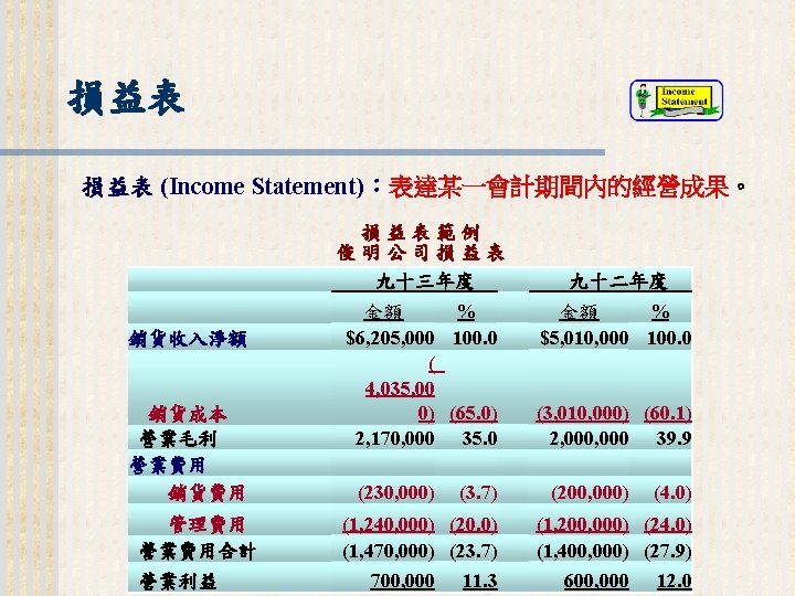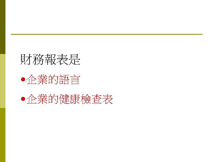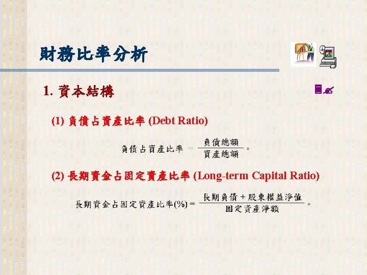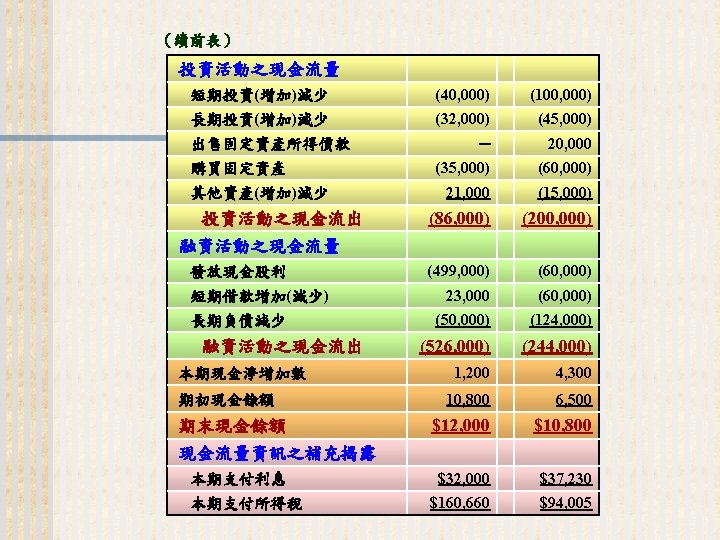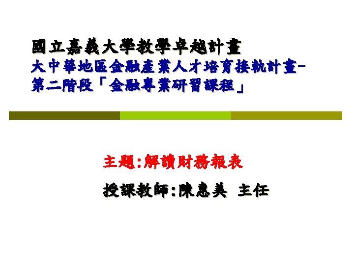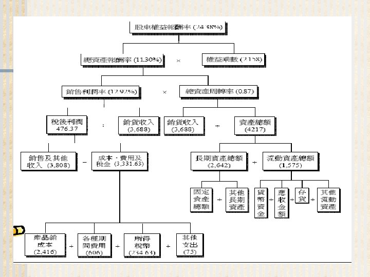 93 1231 92 1231 12 000 0 7 Slides: 32 Download presentation 嘉興 公 司 資 產 負 債 表 資產 流動資產 現金 短期投資 應收票據及帳款 存貨 預付款項 其他流動資產合計 長期投資 固定資產 成本:土地 建築物 機器設備 減:累計折舊 固定資產淨額 其他資產 資產合計 93年 12月31日 92年 12月31日 差額 金額 金額 % % $12, 000 0. 7 $10, 800 0. 7 $1, 200 250, 000 15 210, 000 13 40, 000 400, 000 23 373, 500 23 26, 500 200, 000 12 241, 500 15 (41, 500) 5, 000 0 7, 000 0 (2, 000) 70, 000 4 56, 000 3 14, 000 937, 000 54. 6 898, 800 54. 9 38, 200 140, 000 8. 2 108, 000 6. 6 32, 000 350, 000 80, 000 130, 000 (35, 000) 525, 000 20 5 8 (2) 31 320, 000 60, 000 145, 000 (30, 000) 495, 000 20 4 9 (2) 30 30, 000 20, 000 (15, 000) (5, 000) 30, 000 114, 000 $1, 716, 000 7 100 135, 000 $1, 636, 800 8 100 (21, 000) $79, 200 (續前表) 負債及股東權益 流動負債 短期借款 應付票據及帳款 預收貨款 應付費用 其他流動負債合計 長期負債 負債合計 股東權益 股本─普通股 資本公積 法定盈餘公積 未分配盈餘 股東權益合計 負債及股東權益合計 $115, 000 90, 000 60, 000 50, 000 345, 000 200, 000 545, 000 6. 7 5. 2 3. 5 2. 9 1. 7 20. 1 11. 7 31. 8 $92, 000 72, 000 45, 000 12, 800 266, 800 250, 000 516, 800 8. 2 6. 4 4. 0 1. 1 23. 8 22. 3 31. 6 $23, 000 18, 000 15, 000 17, 200 78, 200 -50, 000 28, 200 660, 000 68, 000 73, 202 369, 798 1, 171, 000 38. 5 4. 0 4. 3 21. 6 68. 2 600, 000 68, 000 25, 000 427, 000 1, 120, 000 53. 6 6. 1 2. 2 38. 1 68. 4 60, 000 0 48, 202 (57, 202) 51, 000 $1, 716, 000 100. 0 $1, 636, 800 100. 0 $79, 200 2. 償債能力 (1) 流動比率 (Current Ratio) (2) 速動比率 (Quick Ratio) (3) 利息保障倍數 (Times Interest Earned, TIE) 3. 經營能力 (1) 應收款項週轉率 (Accounts Receivable Turnover) (2) 存貨週轉率 (Inventory Turnover) 與平均售貨日數 (DSO) 4. 獲利能力 (1) 資產報酬率 (Returns on Assets, ROA) • 杜邦方程式 (Du Pont Equation): (2) 股東權益報酬率 (Returns on Equity, ROE) • 延展杜邦方程式 (Extended Du Pont Equation): (3) 純益率 (Profit Margin) (4) 每股盈餘 (Earnings per Share, EPS) (5) 本益比 (Price-Earnings Ratio) 5. 現金流量 (1) 現金流量比率 (Cash Flow Ratio) (2) 現金流量允當比率 (Fund Flow Adequacy Ratio) (3) 現金再投資比率 (Fund Reinvestment Ratio)
