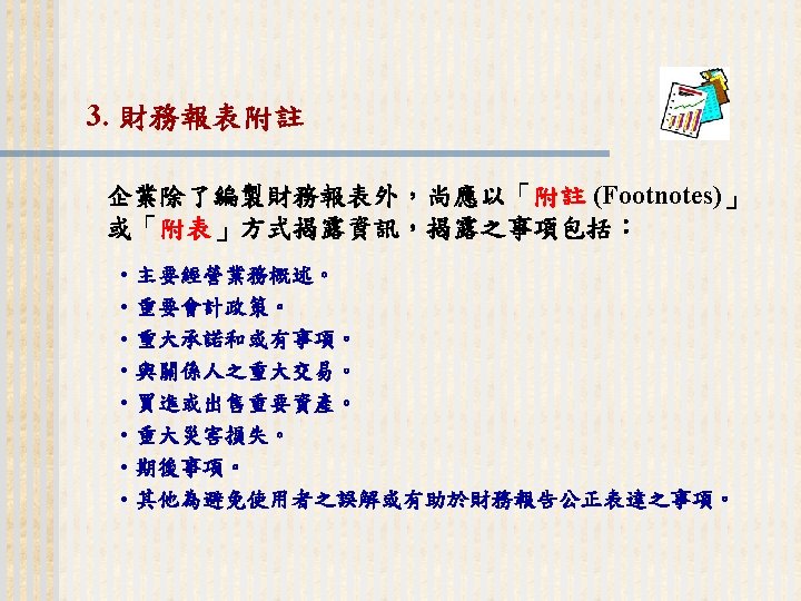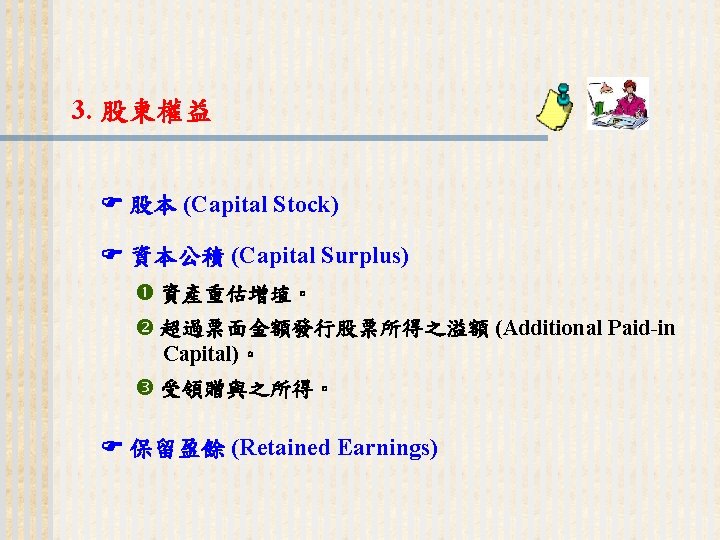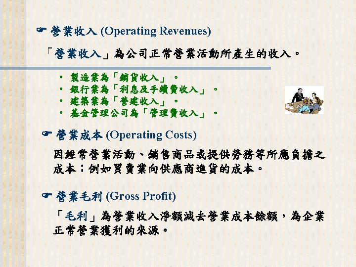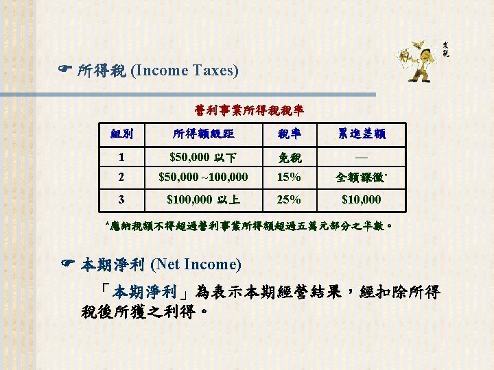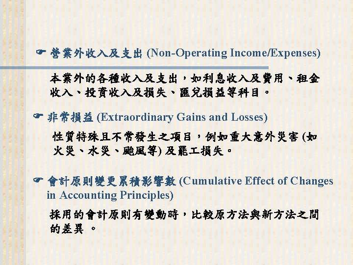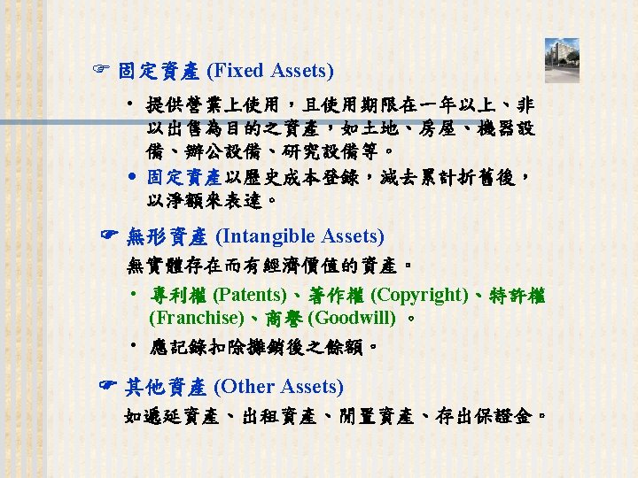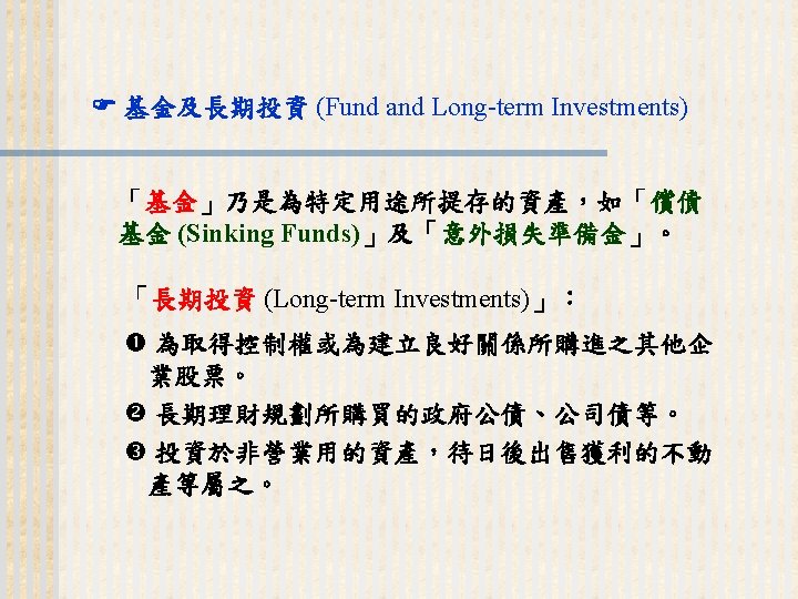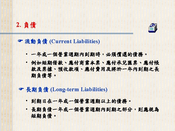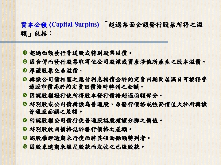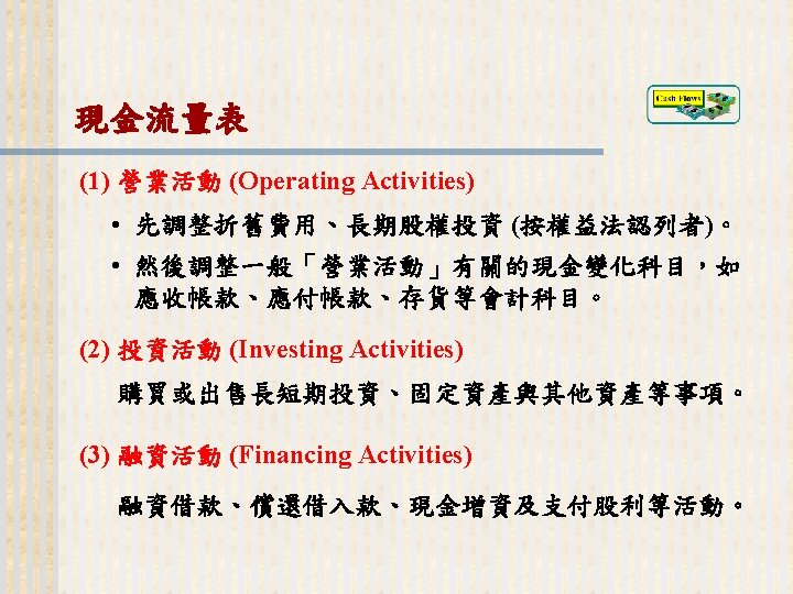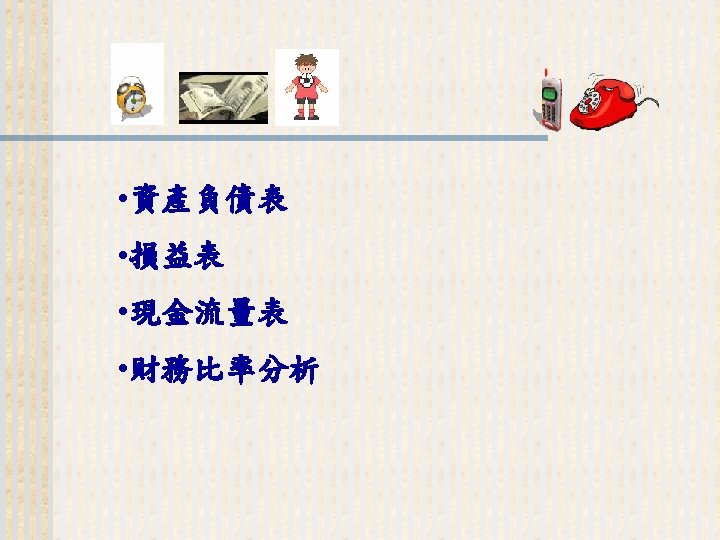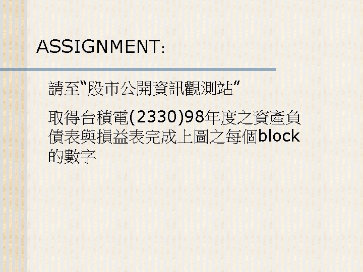 93 1231 92 1231 12 000 0 7 Slides: 32 Download presentation 嘉興 公 司 資 產 負 債 表 資產 流動資產 現金 短期投資 應收票據及帳款 存貨 預付款項 其他流動資產合計 長期投資 固定資產 成本:土地 建築物 機器設備 減:累計折舊 固定資產淨額 其他資產 資產合計 93年 12月31日 92年 12月31日 差額 金額 金額 % % $12, 000 0. 7 $10, 800 0. 7 $1, 200 250, 000 15 210, 000 13 40, 000 400, 000 23 373, 500 23 26, 500 200, 000 12 241, 500 15 (41, 500) 5, 000 0 7, 000 0 (2, 000) 70, 000 4 56, 000 3 14, 000 937, 000 54. 6 898, 800 54. 9 38, 200 140, 000 8. 2 108, 000 6. 6 32, 000 350, 000 80, 000 130, 000 (35, 000) 525, 000 20 5 8 (2) 31 320, 000 60, 000 145, 000 (30, 000) 495, 000 20 4 9 (2) 30 30, 000 20, 000 (15, 000) (5, 000) 30, 000 114, 000 $1, 716, 000 7 100 135, 000 $1, 636, 800 8 100 (21, 000) $79, 200 (續前表) 負債及股東權益 流動負債 短期借款 應付票據及帳款 預收貨款 應付費用 其他流動負債合計 長期負債 負債合計 股東權益 股本─普通股 資本公積 法定盈餘公積 未分配盈餘 股東權益合計 負債及股東權益合計 $115, 000 90, 000 60, 000 50, 000 345, 000 200, 000 545, 000 6. 7 5. 2 3. 5 2. 9 1. 7 20. 1 11. 7 31. 8 $92, 000 72, 000 45, 000 12, 800 266, 800 250, 000 516, 800 8. 2 6. 4 4. 0 1. 1 23. 8 22. 3 31. 6 $23, 000 18, 000 15, 000 17, 200 78, 200 -50, 000 28, 200 660, 000 68, 000 73, 202 369, 798 1, 171, 000 38. 5 4. 0 4. 3 21. 6 68. 2 600, 000 68, 000 25, 000 427, 000 1, 120, 000 53. 6 6. 1 2. 2 38. 1 68. 4 60, 000 0 48, 202 (57, 202) 51, 000 $1, 716, 000 100. 0 $1, 636, 800 100. 0 $79, 200 2. 償債能力 (1) 流動比率 (Current Ratio) (2) 速動比率 (Quick Ratio) (3) 利息保障倍數 (Times Interest Earned, TIE) 3. 經營能力 (1) 應收款項週轉率 (Accounts Receivable Turnover) (2) 存貨週轉率 (Inventory Turnover) 與平均售貨日數 (DSO) 4. 獲利能力 (1) 資產報酬率 (Returns on Assets, ROA) • 杜邦方程式 (Du Pont Equation): (2) 股東權益報酬率 (Returns on Equity, ROE) • 延展杜邦方程式 (Extended Du Pont Equation): (3) 純益率 (Profit Margin) (4) 每股盈餘 (Earnings per Share, EPS) (5) 本益比 (Price-Earnings Ratio) 5. 現金流量 (1) 現金流量比率 (Cash Flow Ratio) (2) 現金流量允當比率 (Fund Flow Adequacy Ratio) (3) 現金再投資比率 (Fund Reinvestment Ratio)