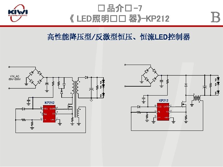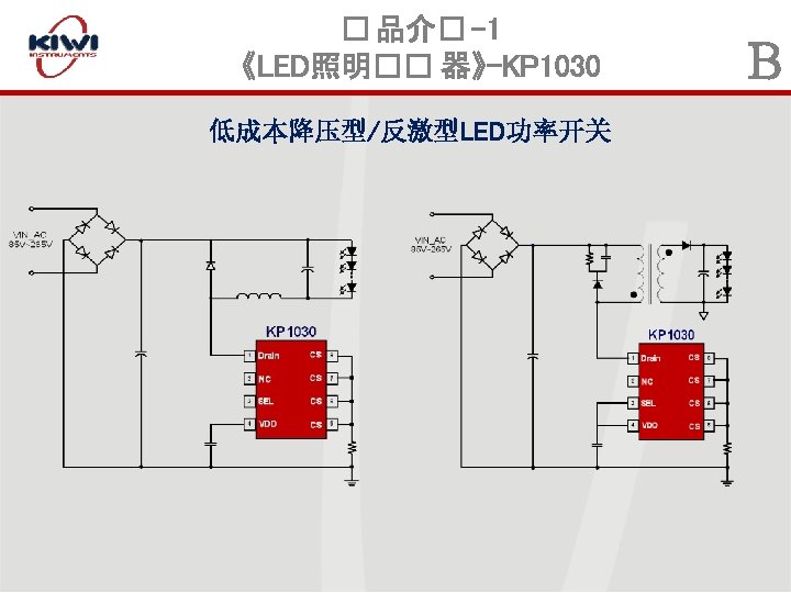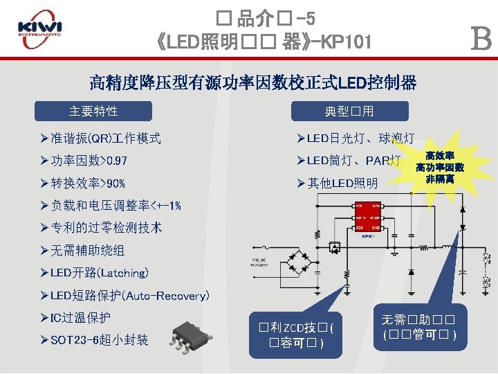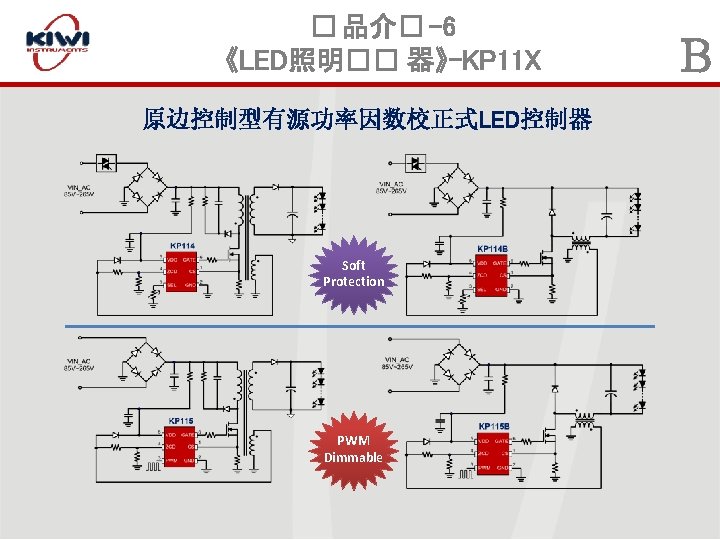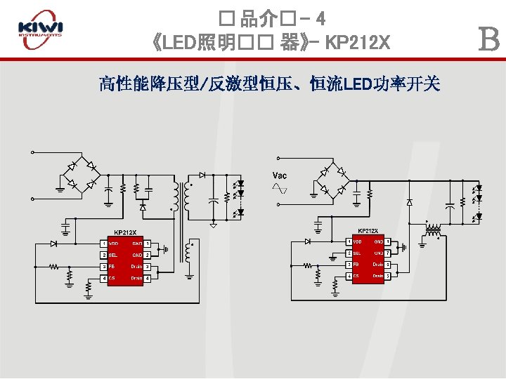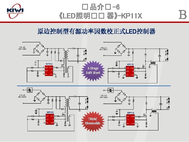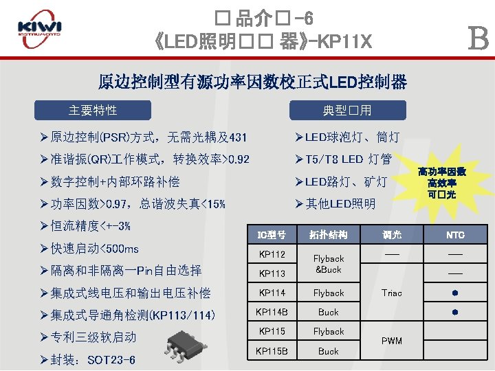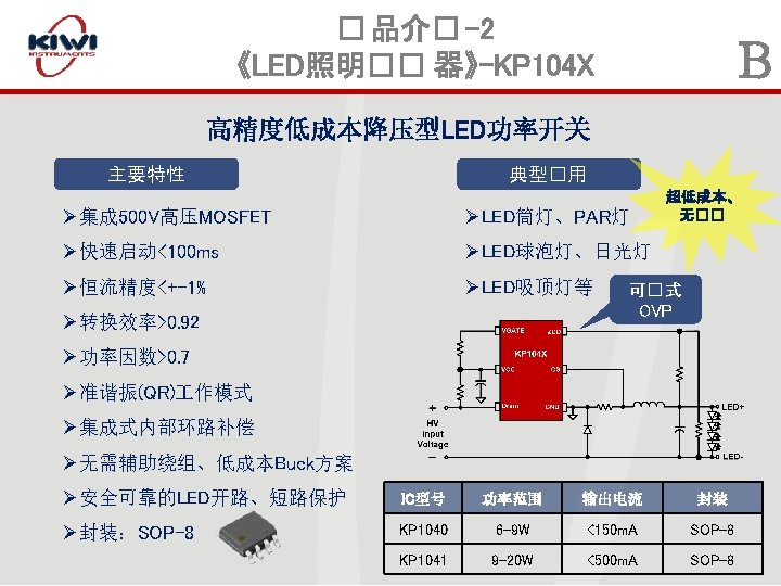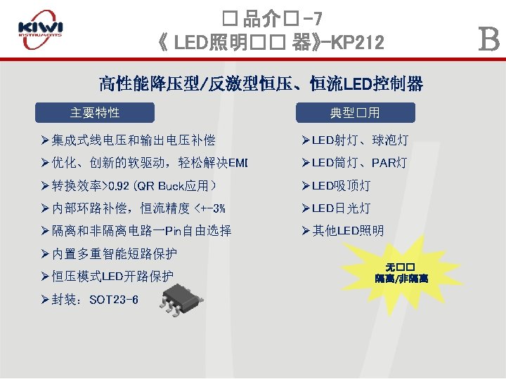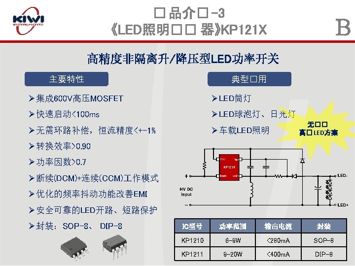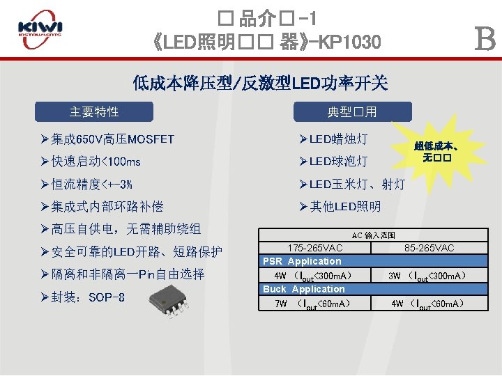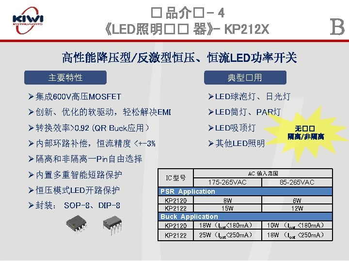 A 选型指南-1 Kiwi LED Driver Solutions 隔离 Power Range Part 1 -5 W 5 -9 W 9 -20 W 1 -30 W 调光 Int FET APFC Packge State SOP-8 MP SOP-8 Q 2 SOP-8 MP ● DIP-8 Q 2 HS ● DIP-8 MP LS LS ● DIP-8 MP HS ● SOT 23 -6 MP LS ● ● ● SOT 23 -6 Q 2 ● SOT 23 -6 MP PSR Buck-Boost KP 1030 ● LS LS ● KP 1040 HS ● KP 1210 HS KP 2120 ● LS KP 1041 KP 1211 NTC TRIAC PWM ● LS ● HS KP 2122 ● KP 101 KP 114 B KP 115 B 1 -60 W 非隔离 LS ● KP 112 ● LS LS ● KP 113 ● LS LS ● SOT 23 -6 Q 2 KP 114 ● LS ● ● ● SOT 23 -6 Q 2 KP 115 ● LS ● SOT 23 -6 MP KP 212 ● LS LS SOT 23 -6 MP