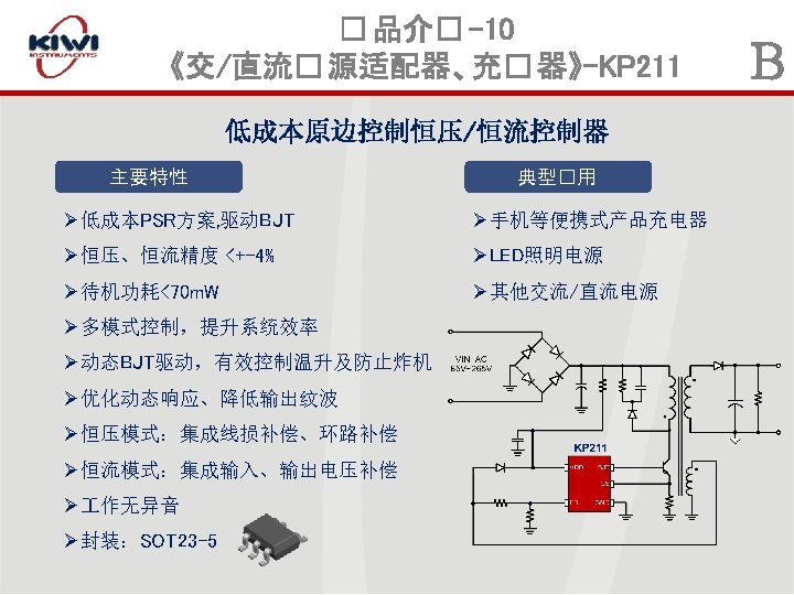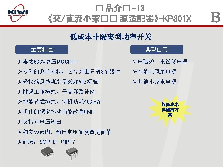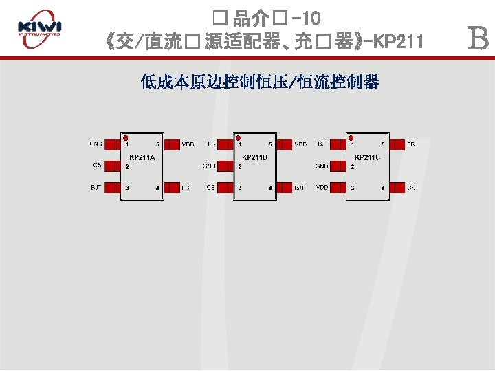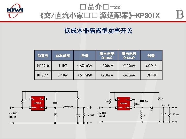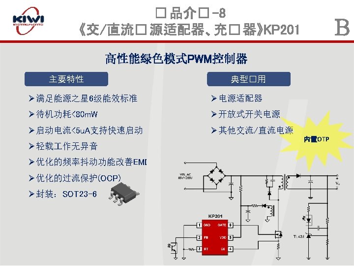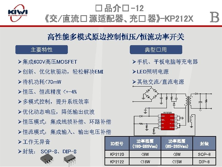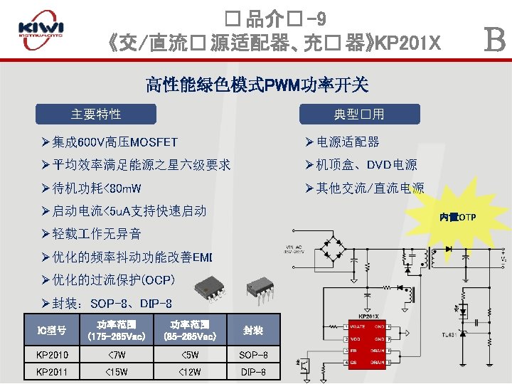 A 选型指南-2 Kiwi Charger / Adapter / SMPS Solutions Power Range 拓扑结构 Part FET BJT OVP/OLP /SCP OTP Standby Power Packge State External ● <100 m. W SOT 23 -5 MP External ● ● <100 m. W SOT 23 -6 MP ● Internal ● ● <100 m. W SOP-8 MP KP 2010 ● Internal ● ● <50 m. W SOP-8 MP KP 2012 ● Internal ● ● <100 m. W DIP-8 MP KP 2122 ● Internal ● ● <100 m. W DIP-8 MP KP 201 ● External ● ● <100 m. W SOT 23 -6 MP KP 212 ● External ● ● <100 m. W SOT 23 -6 MP 1 -60 W KP 201 ● External ● ● <100 m. W SOT 23 -6 MP 50 -100 W KP 221 ● External ● ● <150 m. W SOP-8 Q 4 60 -500 W KP 231 ● External ● ● <300 m. W SOP-16 Q 4 PSR Fly-Back LLC KP 211 ● KP 212 ● KP 2120 1 -6 W 5 -12 W 1 -30 W