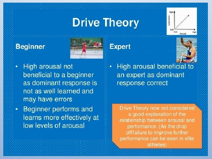 Critique of Drive Theory • Athletes in autonomous phase of learning making high profile basic errors – dominant response? • No account for cognitive or somatic anxiety