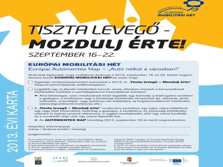 2013. évi Karta testületi/bizottsági/közgyűlési döntés polgármester aláírja a Kartát másodpéldány visszaküldése az NFM-be on-line regisztráció a nemzetközi honlapon www. mobilityweek. eu • Arany fokozatú részvétel a 3 vállalás együtt: – „Közlekedj ÖKOsan!” EMH heti program – állandó intézkedés(ek) elindítása – AMN szervezés lehetőleg szeptember 22én • •