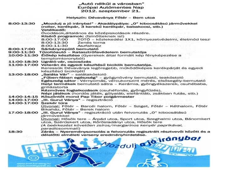 A Nemzeti Fejlesztési Minisztérium koordinációs projekt tervei a 2013. évi kampányhoz • Közlekedésbiztonsági és egyéb ajándékok (fényvisszaverő mellény, póló, sapka) • Egységes kommunikációs segédanyagok elkészítése, használata (logó, plakátok, molinó, banner) • A sajtó folyamatos informálása a települések csatlakozásáról • Médiakampány elindítása • Megújuló EMH honlap • Hírlevélben folyamatos tájékoztatás • Személyes találkozók szervezése