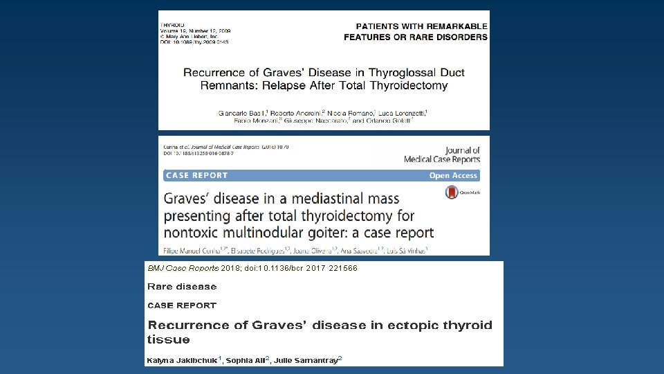 Patient History The patient is a 35 -year-old woman who presented to a physician with complaints associated with hyperthyroidism 5 years ago, for first time and has been treated initially with Methimazole and then with radioactive iodine with a diagnosis of Graves' disease. Despite a high RAIU (always > 40%), Radioiodine therapy was repeated 3 times due to RAI resistance and disease recurrence. After the third round of radioiodine therapy, severe Graves ophthalmopathy has occurred that has been controlled with multiple injections of intravenous glucocorticoid (Methyl Prednisolone). Finally, thyroidectomy was performed 4 years ago due to resistant hyperthyroidism and thereafter, replacement therapy with LT 4 (700 µg/week) was started.