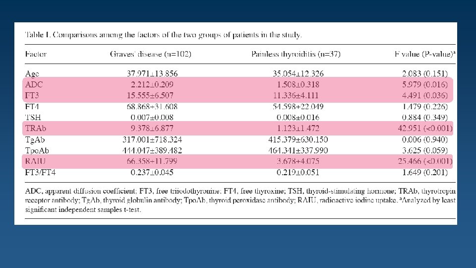 The aim of the present study was to assess the apparent diffusion coefficient (ADC) in diffusion-weighted imaging (DWI), thyroid radioactive iodine uptake (RAIU), thyroid scintigraphy and thyrotropin receptor antibody (TRAb) levels in the differential diagnosis between Graves' disease (GD) and painless thyroiditis (PT). A total of 102 patients with GD and 37 patients with PT were enrolled in the study.