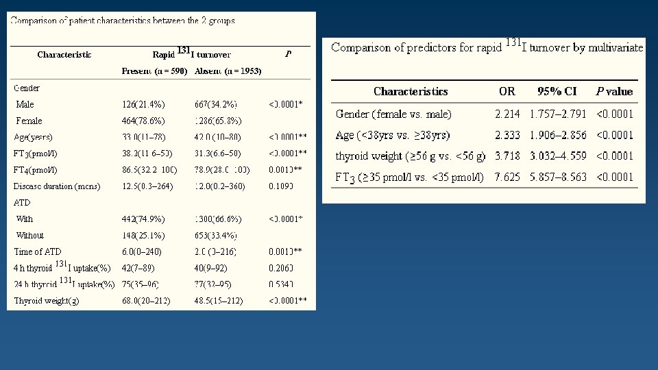 The clinical data on 2543 patients were retrospectively reviewed. Patients were divided into 2 groups depending on present or absent with rapid 131 I turnover defined as a 4 hour to 24 -hour 131 I uptake ratio of ≥ 1. Overall, 590 cases (23. 2%) had a rapid 131 I turnover.