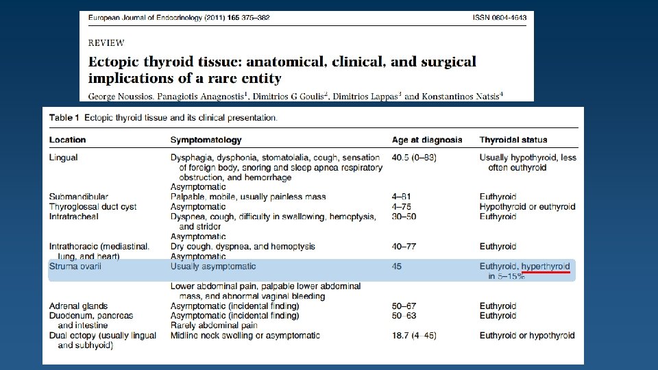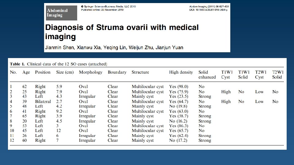 From January 1990 to January 2012, a total of 68 patients were diagnosed struma ovarii. RESULTS: The median age of patients was 42 years old (17 -81 years). [Struma ovarii is most common between the ages of 40 and 60 years. ] Uptodate 94% were diagnosed benign struma ovarii and 6% were malignant struma ovarii. 47% patients were identified with pelvic mass by ultrasonic test, 41% had clinical abdominal pain, 12% touched a mass from abdominal wall. Ascites was present in 6% patients. 75% were mulitcystic lesions, 4% solid lesions and 21% solid-cystic tumors. No patient had hyperthyroidism presentation. [Approximately 5 to 15 percent of women with struma ovarii have hyperthyroidism due to a thyroid adenoma in the struma]Uptodate